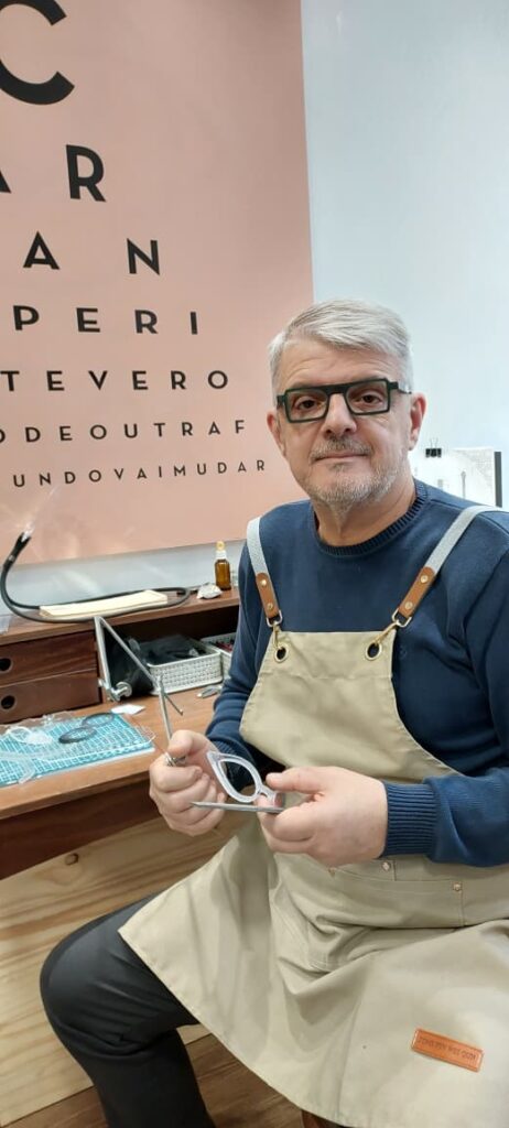 Em 2022, durante a Silmo de Paris, Carlos descobriu o universo do design autoral de armações e encontrou um novo caminho para sua paixão. Desde então, ele se dedica à pesquisa de maquinário, ferramentas e materiais, ao estudo de design de óculos e ao refinamento do acabamento, sempre com o olhar treinado de quem tem décadas de experiência com o ajuste perfeito.