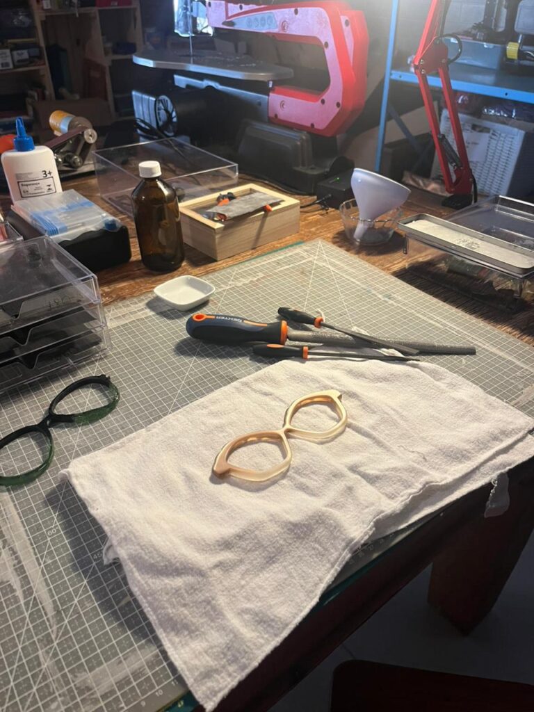 Antes mesmo de pegar numa lima ou esculpir um acetato, mergulhei em pesquisas. Queria entender esse novo mundo, o dos criadores de óculos, os lunetiers, que, para mim, soava quase mítico. Descobri nomes que já admirava de longe: Filipe Diniz, que trouxe o ofício de volta à cena brasileira; Ricardo Lorente, com seu ateliê cheio de ferramentas e paciência; Érida Schaefer, com a delicadeza da @otro.eyewear; e tantos outros que transformam matéria-prima em poesia visual.